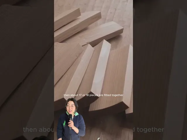 Each vessel begins with a cedar log split into wedge-shaped boards. After drying, the boards are shaved and shaped, then about seventeen to eighteen pieces are fitted together to form a seamless circle.